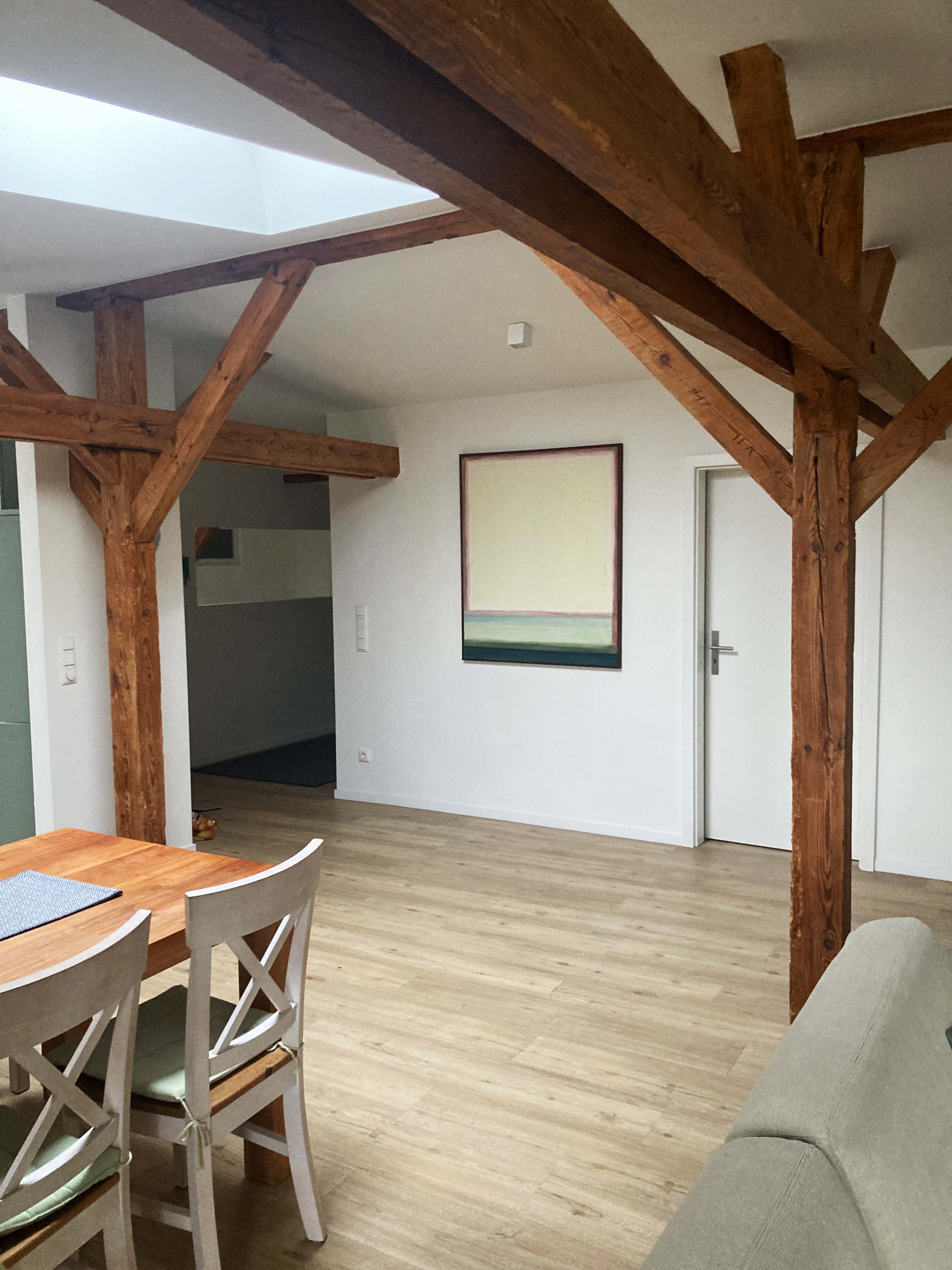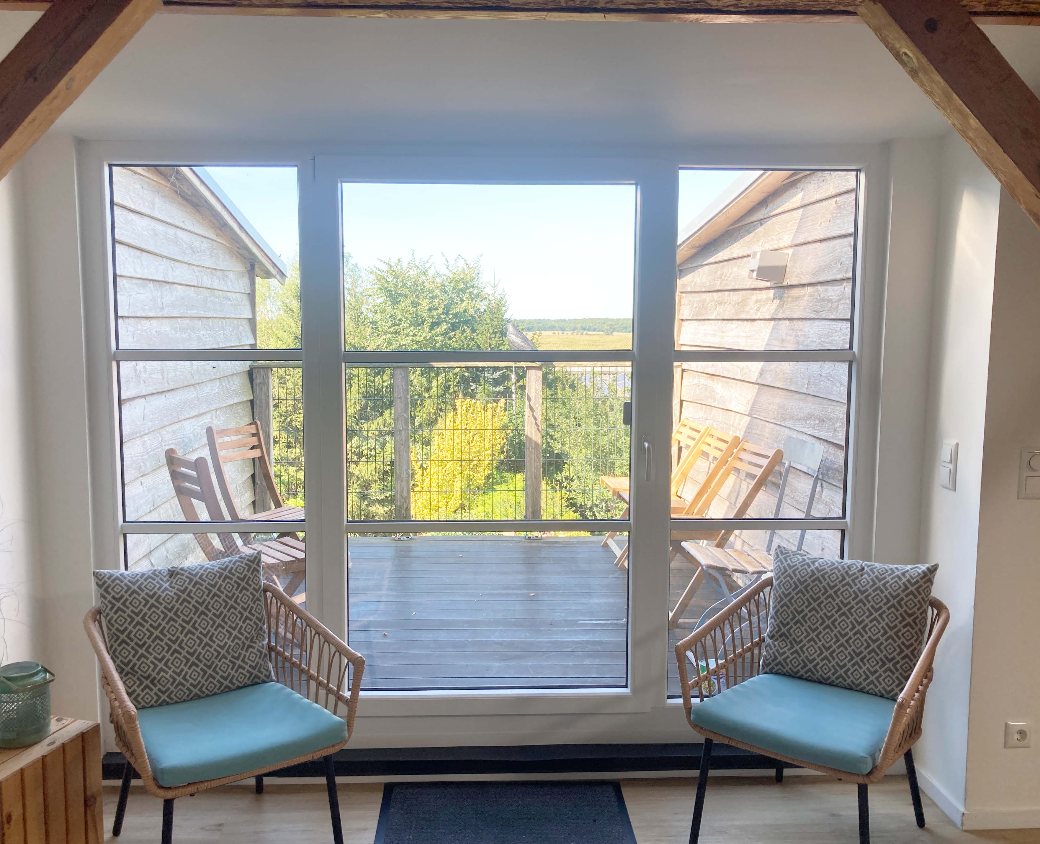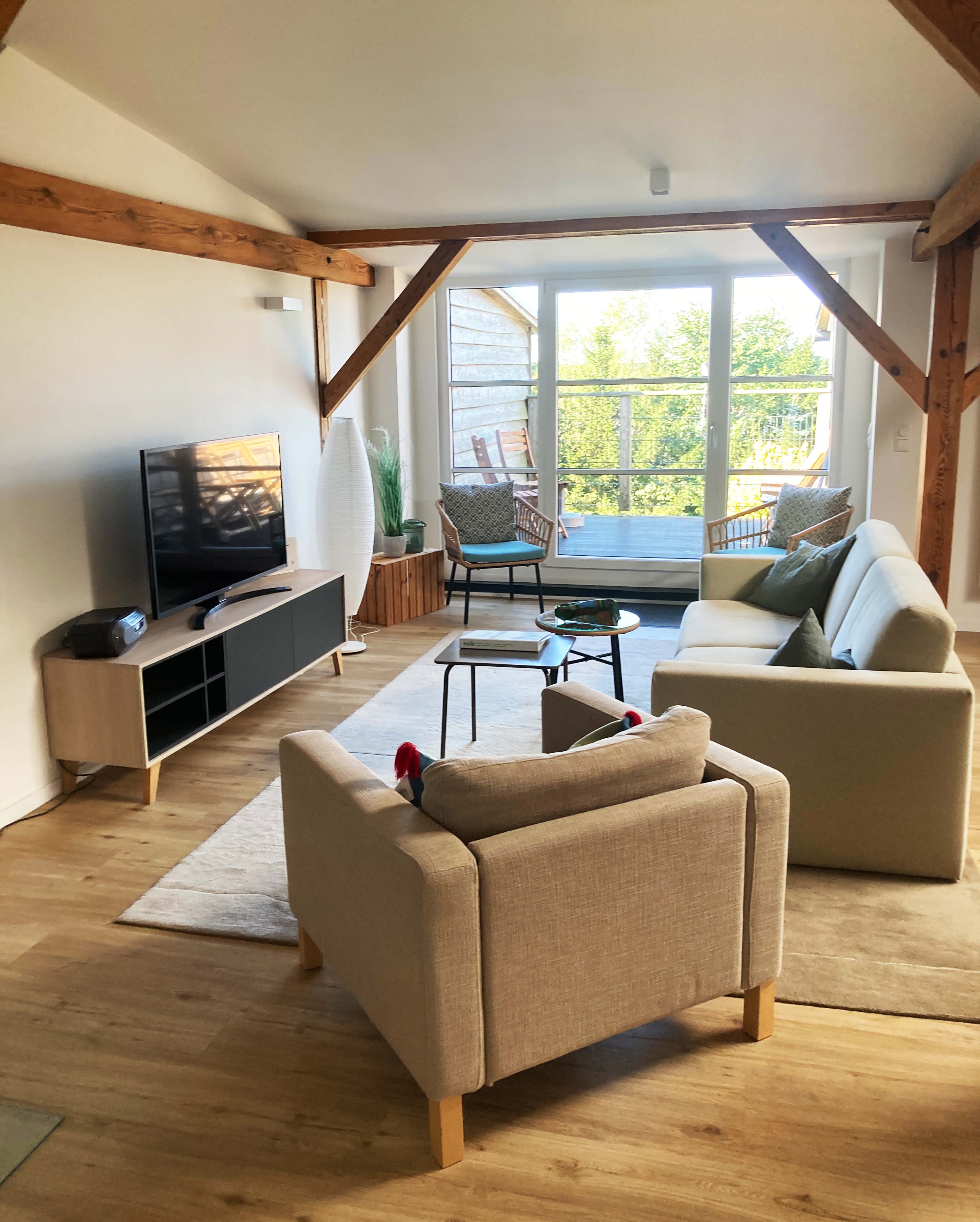 Unsere Ferienwohnung „Weitblick“ bietet Ihnen auf 115 Quadratmetern ein exklusives Wohnerlebnis im modernen Loft-Stil. Mit viel Liebe zum Detail haben wir eine Umgebung geschaffen, die Komfort und Ruhe vereint: